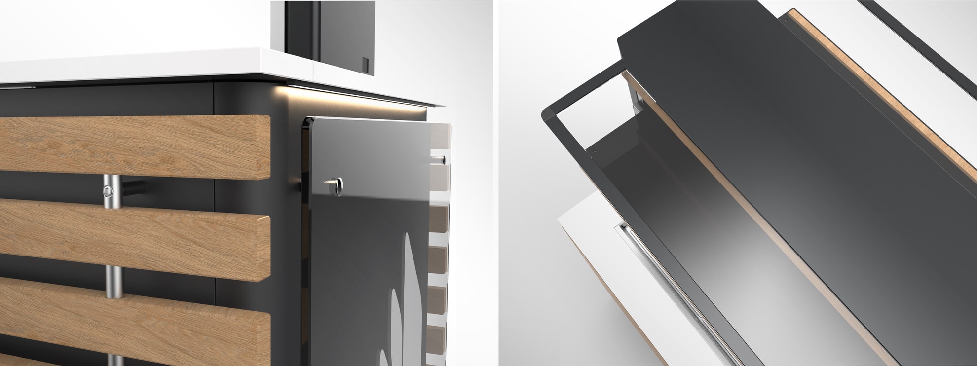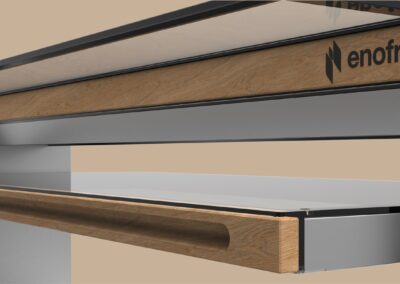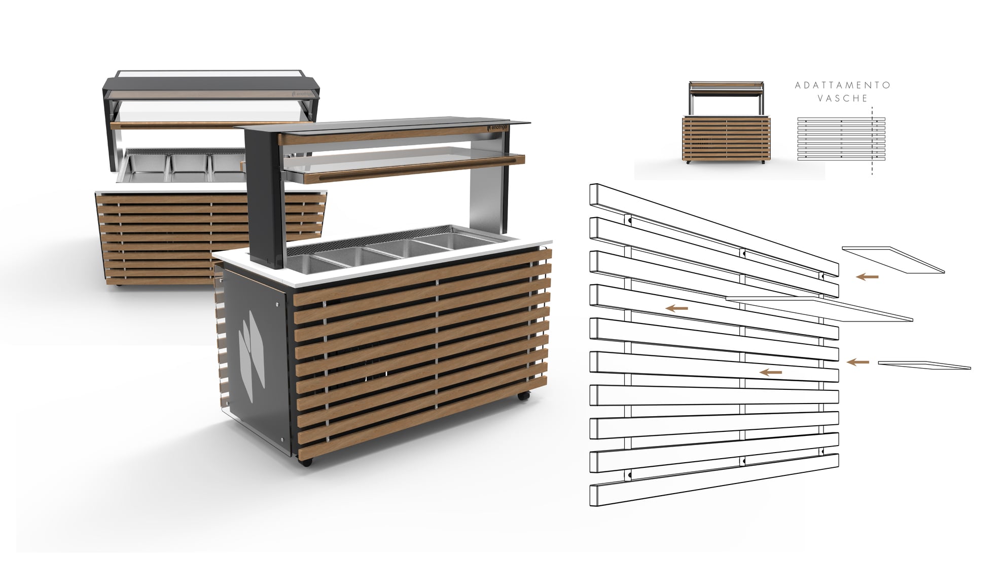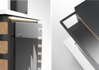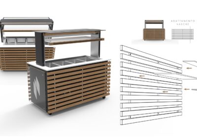 Un mobile buffet che nasce dall’esigenza di trovare una soluzione estetica che sposasse il concetto di modularità (per adattarsi alle varie lunghezze delle vasche) e versatilità (per ospitare svariati accessori a seconda delle esigenze) il tutto pensato sulle possibilità tecnico- produttive di una falegnameria.