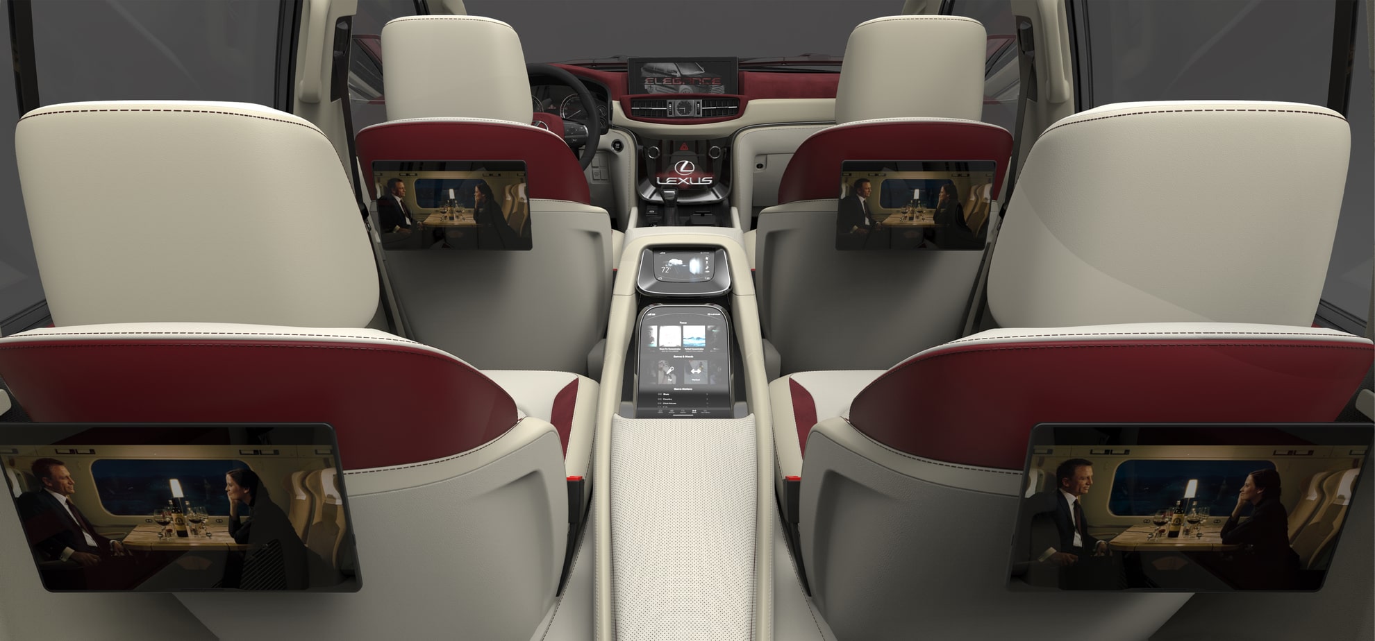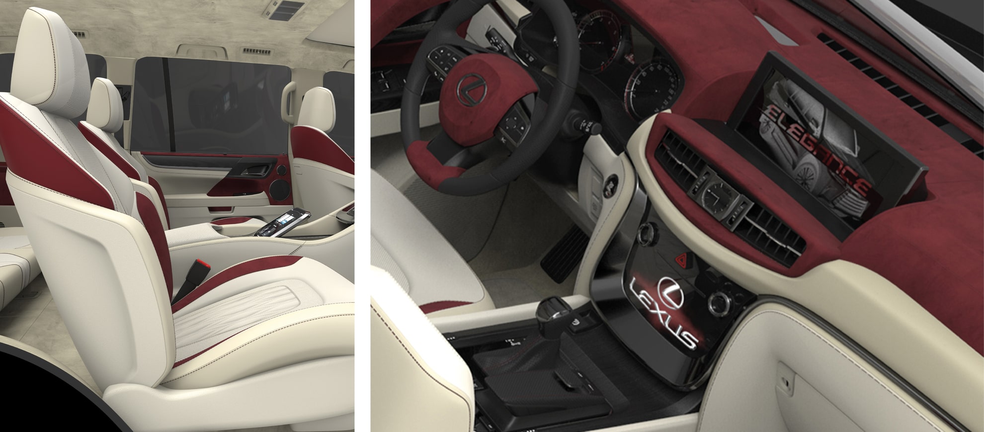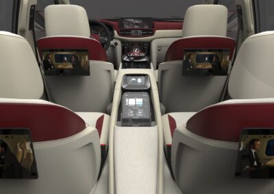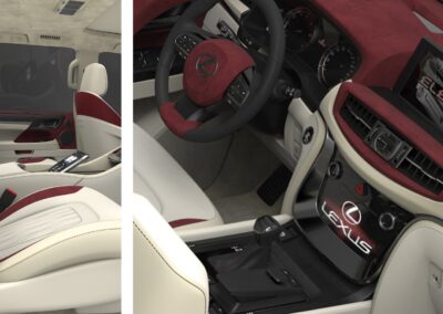 Personalizzazione elegante di lusso dell’interno di un suv 7 posti marchiato Lexus, pensato specificatamente per il mercato arabo. Partendo da uno progetto di produzione gli interventi hanno interessato principalmente sedili, dashboard, e consolle centrale.
